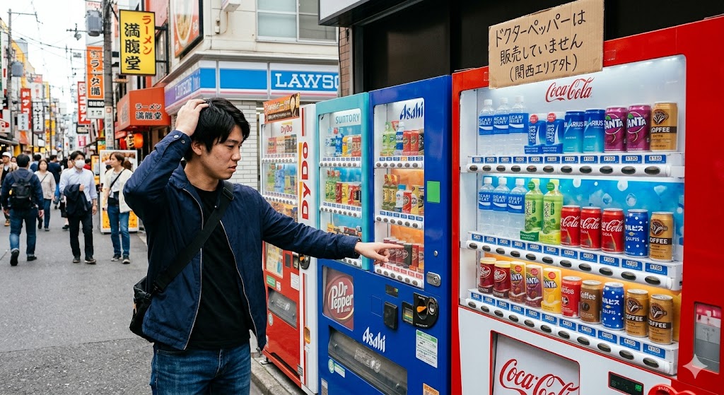 関西地方や九州地方などでは、地元の自動販売機でドクターペッパーを探しても見つからないことが珍しくありません。