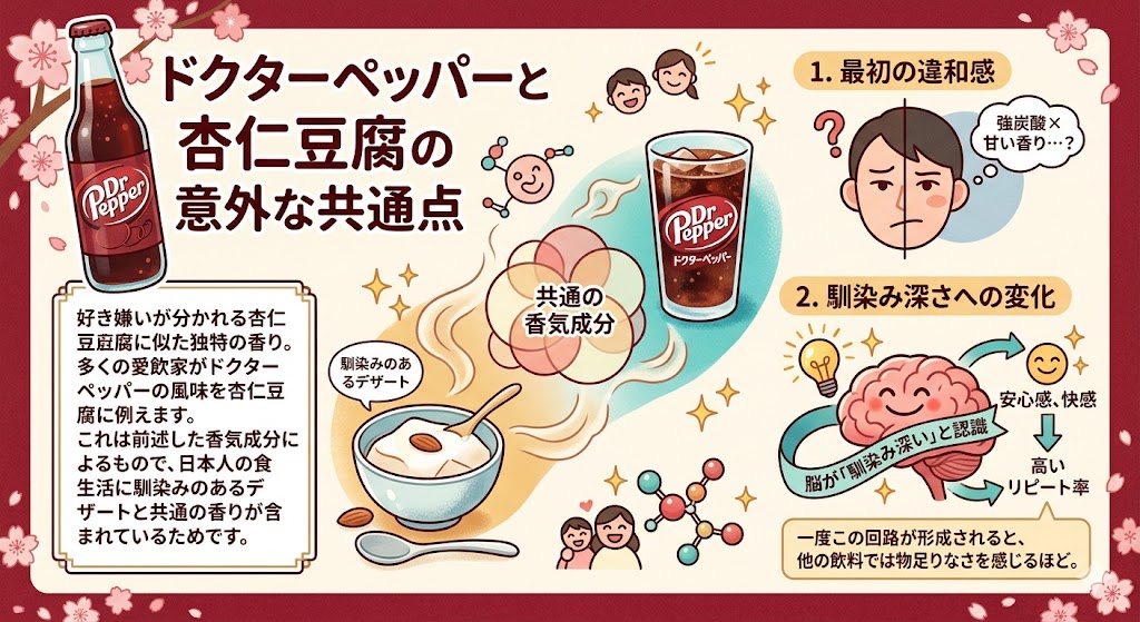 多くの愛飲家がドクターペッパーの風味を杏仁豆腐に例えます。